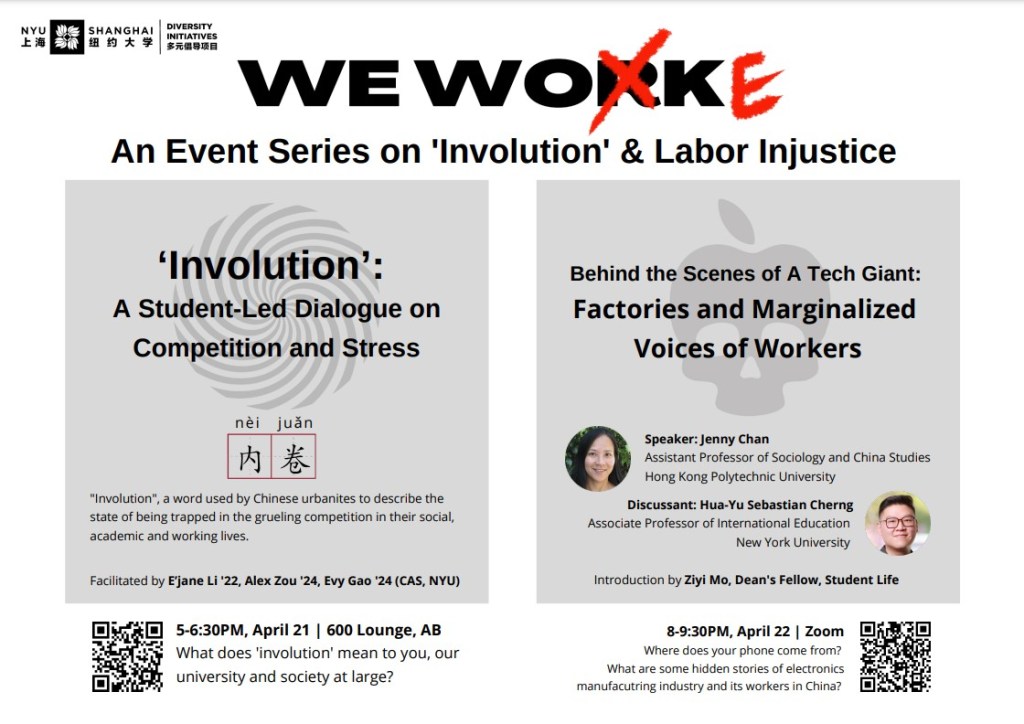 Dr Jenny Chan, “Behind the Scenes of a Tech Giant: Factories and Marginalized Voices of Workers.” Moderated by Dr Hua-Yu Sebastian Cherng (Associate Professor of International Education, New York University) and Ziyi Mo (Dean’s Fellow, Student Life), with support from Joyce Tan (Specialist of Diversity Initiatives), NUY Shanghai, online, 22 April 2021.
