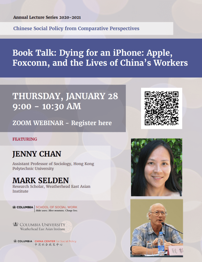 This book talk focuses on the life and death struggles of a new generation of Chinese workers who produce our iPhones, Kindles, and Xboxes. Between the rash of employee suicides in 2010 and the outbreak of coronavirus at the end of 2019, my colleagues and I engaged with Foxconn workers through interviews as well as their shared poems, songs, open letters, photos, and videos, supplemented with meetings with managers and government officials. Taiwanese-owned Foxconn is the world’s largest electronics manufacturer and China’s largest exporter. During the period of rapid business growth in the wake of the 2008-2009 global financial crisis, Foxconn workers and interning students were transferred between factories to reach ever-higher productivity and profit goals. This reflects an emergent pattern of massive, corporate-led forced migration. From a broader perspective, the fluctuation of orders, coupled with tight delivery requirements, shifts production pressure from global buyers like Apple to Foxconn and smaller suppliers in transnational manufacturing. In key nodes of globalized electronics production, large-scale labor strikes can send important messages to the Chinese state, to Foxconn, and to global brands. Should workers at Foxconn and elsewhere succeed in organizing and mobilizing effectively, they would inspire many more to strive to make a better future together.